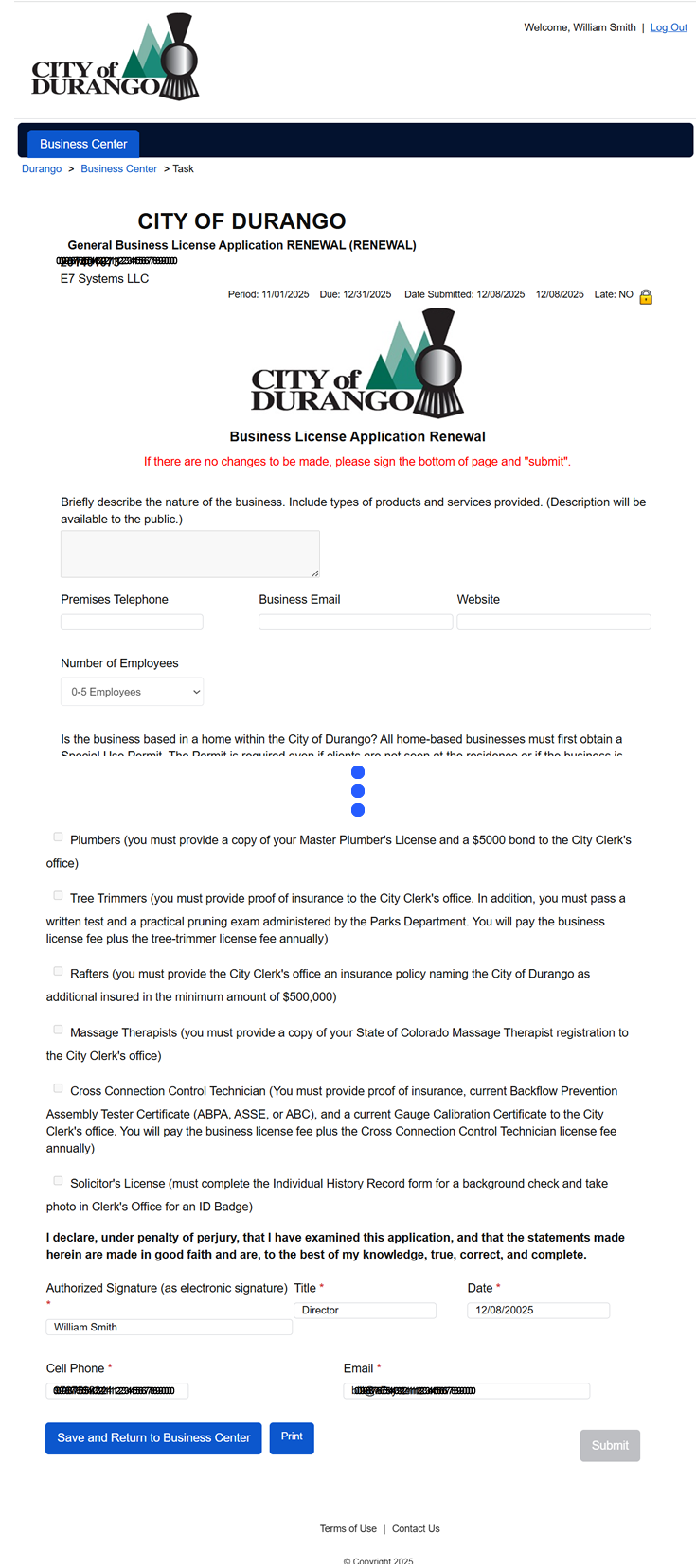 A clean, streamlined interface for managing business functions and payments, including license renewals, tax filings, and account updates. The organized layout provides fast, convenient access to essential municipal services through an intuitive, user-friendly online portal.